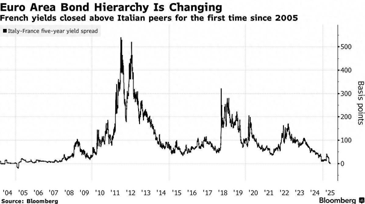 德国商业银行利率与信贷研究主管克里斯托夫·里格尔指出,巴黎当前的政治僵局与财政改革受阻,已对法国债务吸引力构成实质性冲击。作为欧元区传统"安全资产"代表,法国债券竟与素以财政宽松著称的意大利站在同一风险定价水平——意大利10年期国债相对于法国的收益率溢价已收窄至17个基点,创2007年以来最低纪录,较三年前近200个基点的差距大幅缩水。